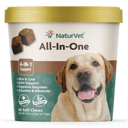 For use in dogs over the age of 12 weeks. Contains a source of live (viable) naturally occurring microorganisms. All-in-one four-in-one support soft chews are the ideal product for your pets essential needs, digestion, skin and coat and vitamins and minerals. Helps support overall health. Also contains glucosamine and chondroitin for added joint support in dogs.